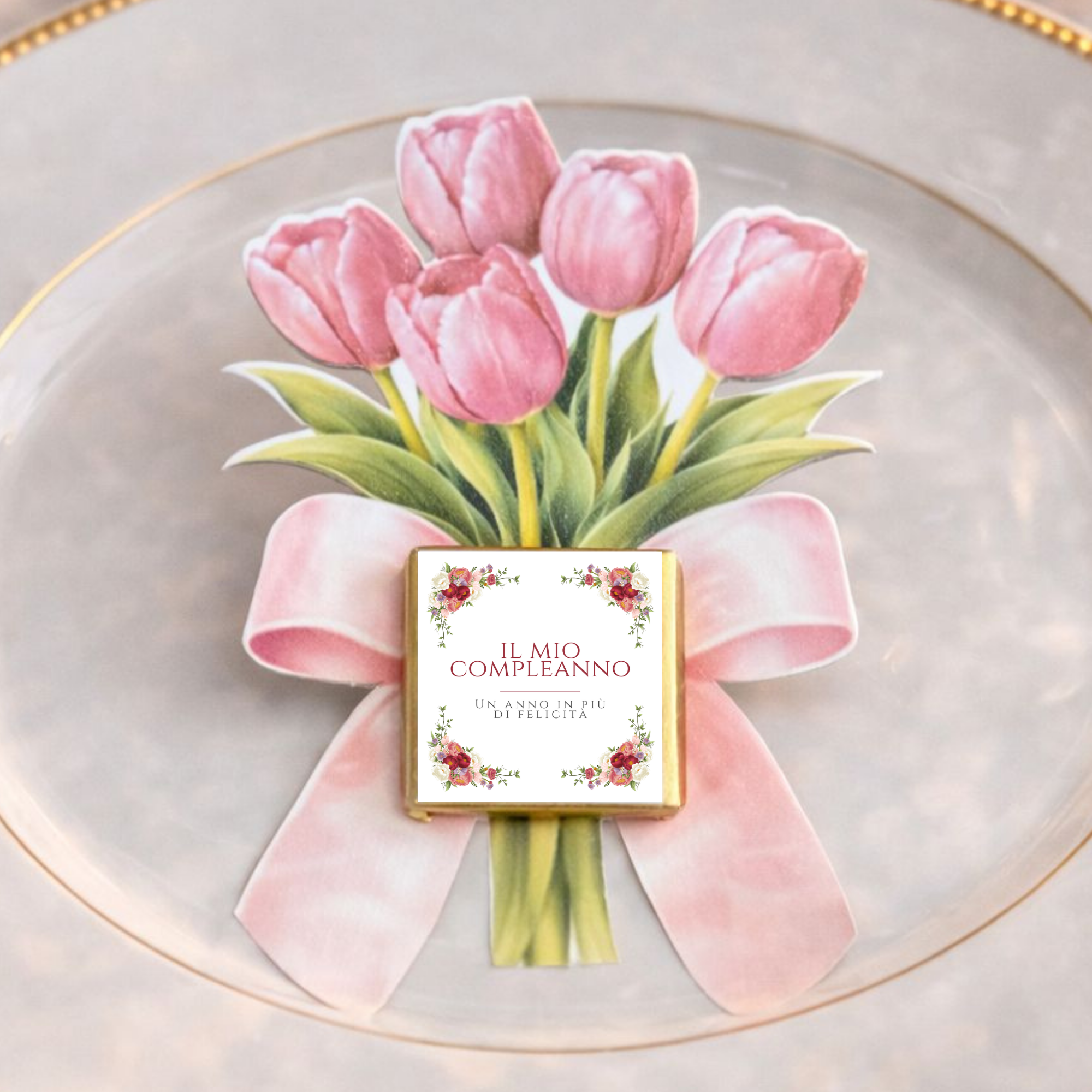 N.B.: Vengono Forniti la grafica in carta martellata dei Tulipani assieme ai Cioccolatini e Grafiche da attaccare ad ogni cioccolatino.