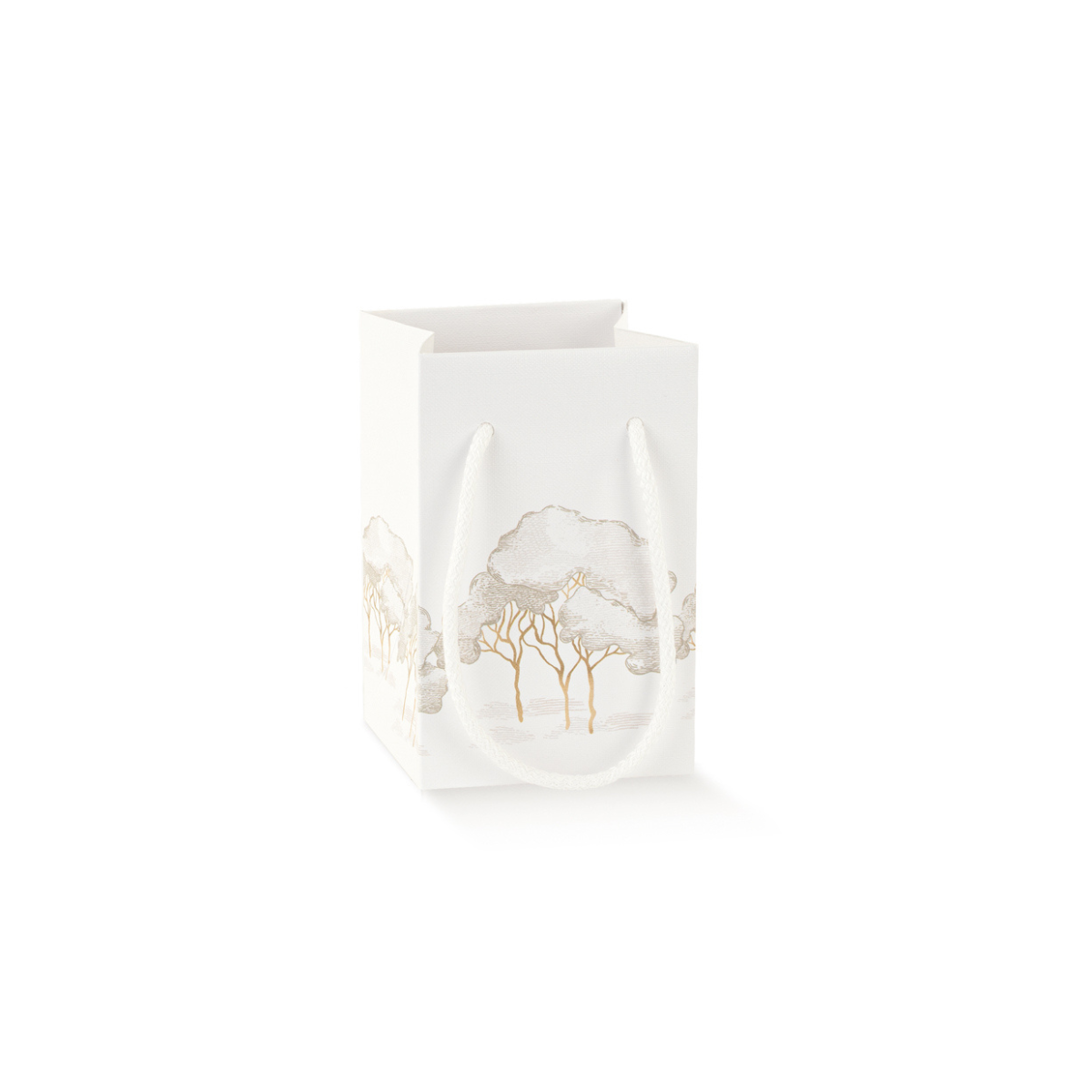 Shopperbox in cartoncino avorio con cordino intrecciato e decorazione alberi, elegante e resistente. Ideale per confezioni regalo, bomboniere o piccoli omaggi. Dimensioni 9x9x14 cm. Articolo Scotton perfetto per presentazioni raffinate e curate nei dettagli.