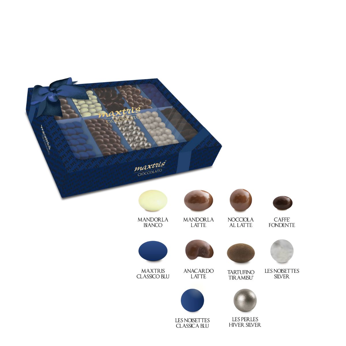 La confezione Vanity Chocolate Blu da 900g è un’elegante scatola natalizia che racchiude un ricco assortimento di praline e confetti Maxtris, pensati per offrire un momento di autentico piacere durante le feste.