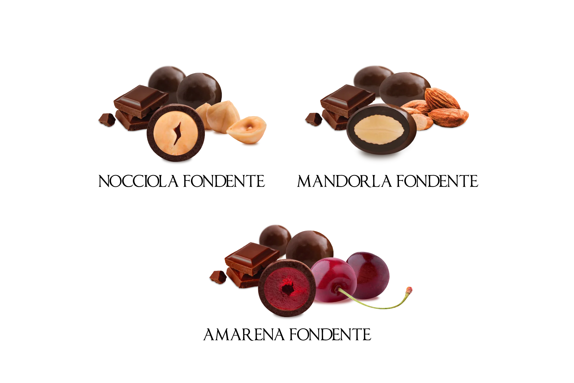 Un irresistibile assortimento di mandorle tostate, nocciole croccanti e amarene saporite, tutte avvolte da un intenso cioccolato fondente, racchiuso in un cilindro dal design festivo ed esclusivo.