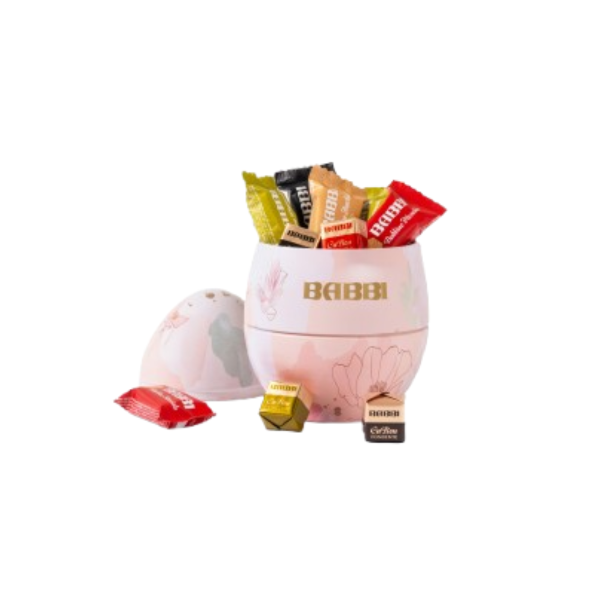 Uovo in latta elegante con Babbini croccanti e Cubon praline morbide, tutti avvolti da delizioso cioccolato. Perfetto come regalo o per una pausa golosa durante le festività.