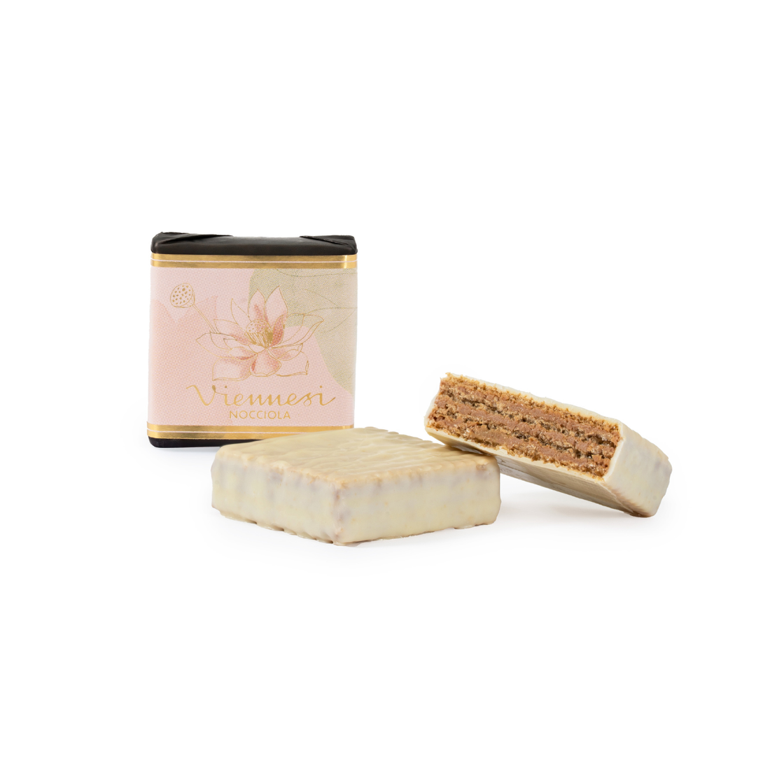 viennesi pasquali con wafer croccante, cuore di crema alla nocciola e copertura di delicato cioccolato bianco. Ideali per omaggi, eventi o per condividere un momento di dolcezza durante le festività.