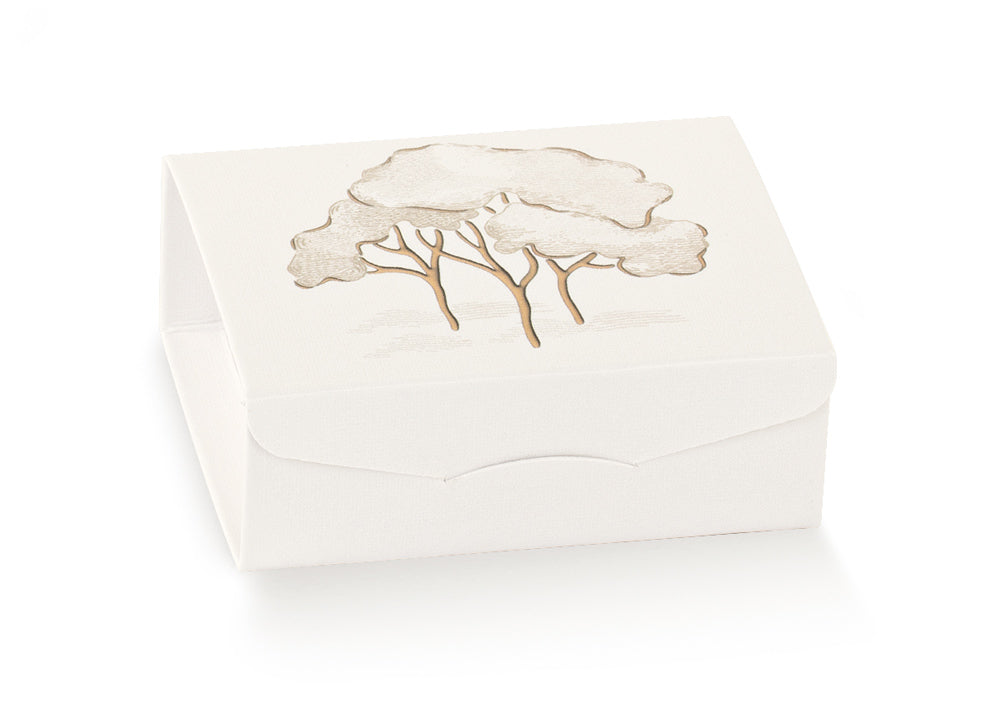 Scatolina regalo Scotton con motivo intrecci alberi color avorio, elegante e raffinata, ideale per piccoli doni e bomboniere. Dimensioni 7×7×3 cm, confezione da 10 pezzi, perfetta per matrimoni, cerimonie ed eventi.