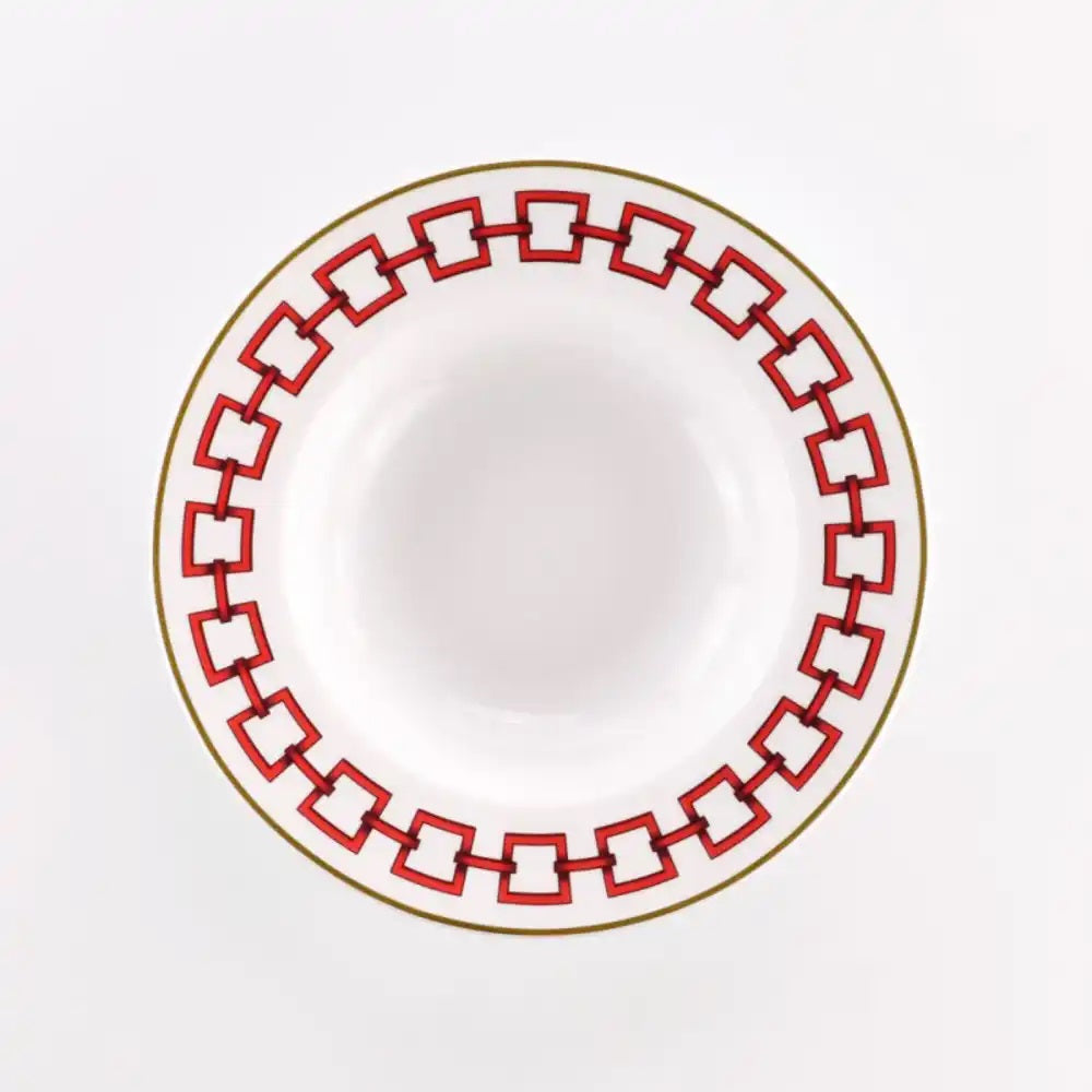 🍽️ Raffinato piatto fondo 23,5 cm della collezione Roma Neoclassico Weissestal Milano, in porcellana con decoro rosso a maglie e catene e filo oro 12 kt. ✨ Ispirato alla storia millenaria di Roma, aggiunge eleganza, personalità e stile unico alla tua tavola. 🇮🇹💛