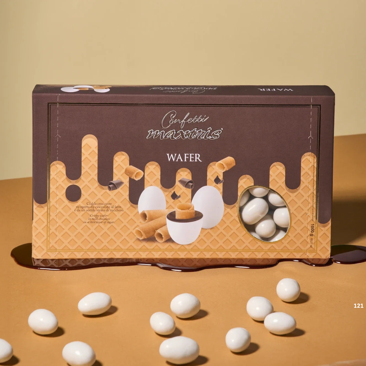 Gaufrette enveloppée d'une couche de chocolat au lait très fin, recouverte d'une fine couche de sucre. Paquets de 1 kg. contient du gluten.