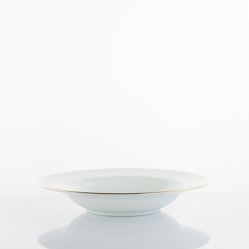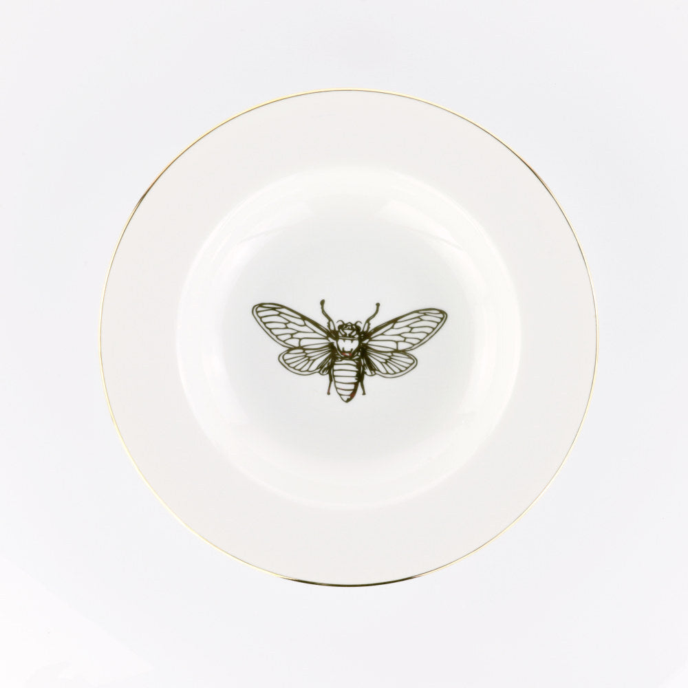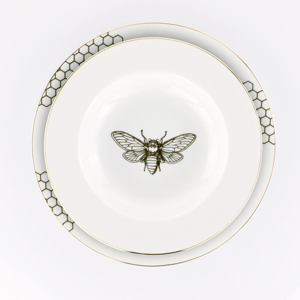 Elegante piatto fondo in porcellana con decoro ispirato alle geometrie delle api e finitura in filo oro 12 kt. Raffinato e originale per tavole di design đŸđŸœïž.