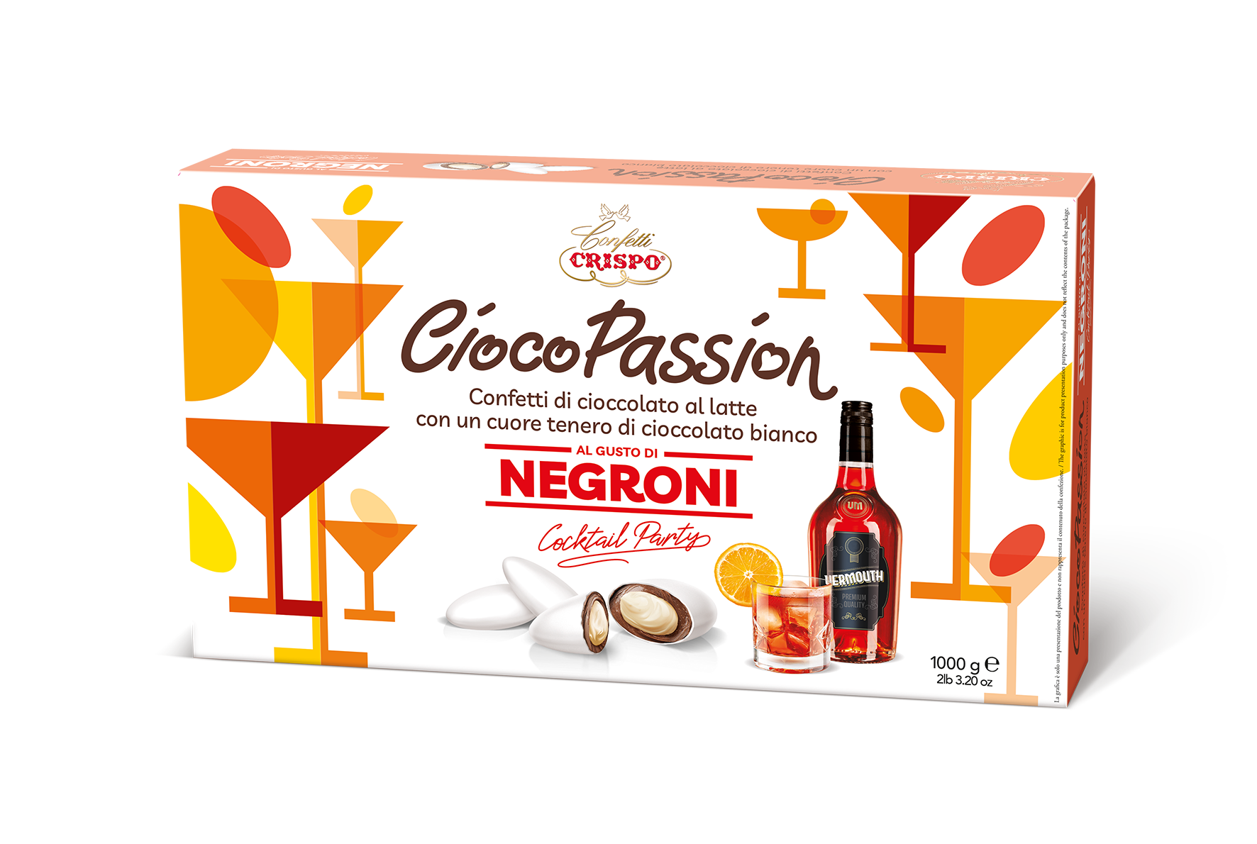 Un confetto dal carattere deciso e sofisticato, ispirato a uno dei cocktail italiani più iconici. I Crispo CiocoPassion racchiudono un cuore di cioccolato bianco al gusto Negroni, avvolto da un delicato strato di cioccolato al latte, per un’esperienza di gusto intensa e sorprendente, con eleganti note aromatiche.