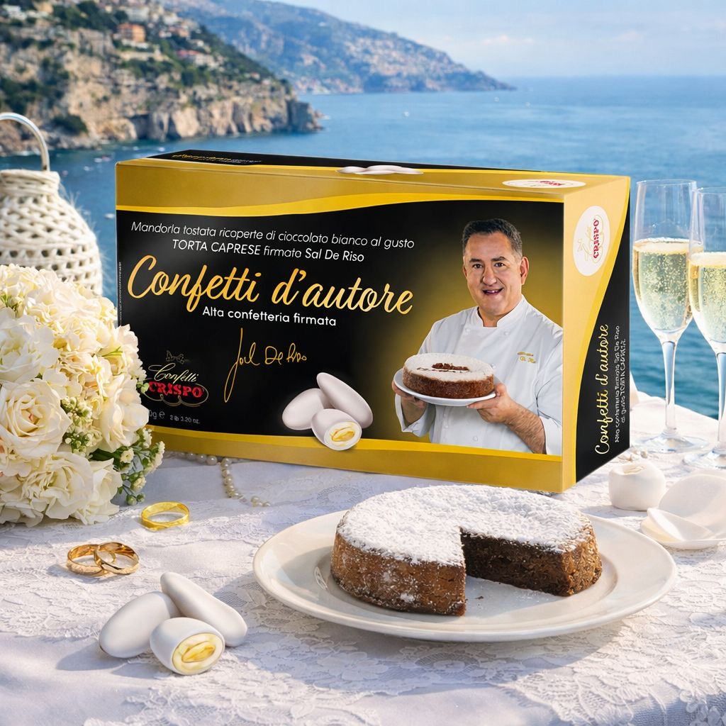 Mandorla tostata ricoperta di cioccolato bianco al gusto torta caprese firmata dal Maestro Pasticciere Sal De Riso